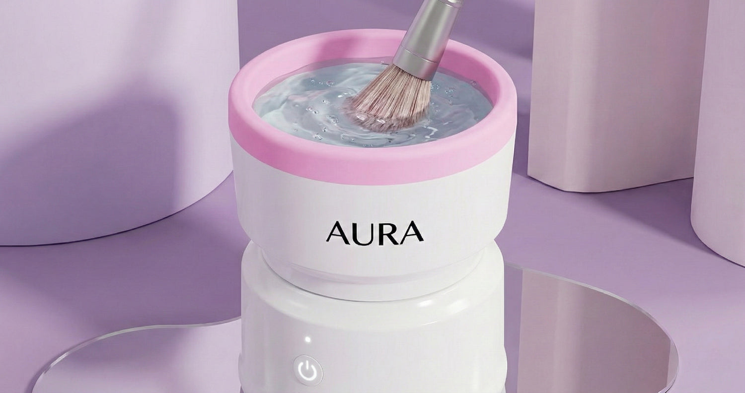 Yes. The Aura Rotary Brush Cleaner features a flexible, universal silicone collar designed to securely hold handles of various thicknesses—from slim eyeliner brushes to thick kabuki foundation brushes—ensuring a stable clean for your entire collection.